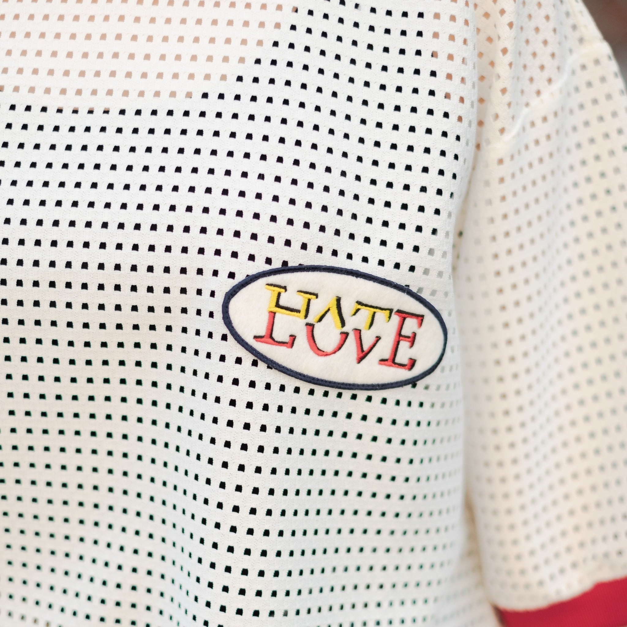 『 LOVE HATE 』のワッペンや、絞る事によりシルエットの変化を楽しめる裾の蛍光コードもデザインのアクセント。