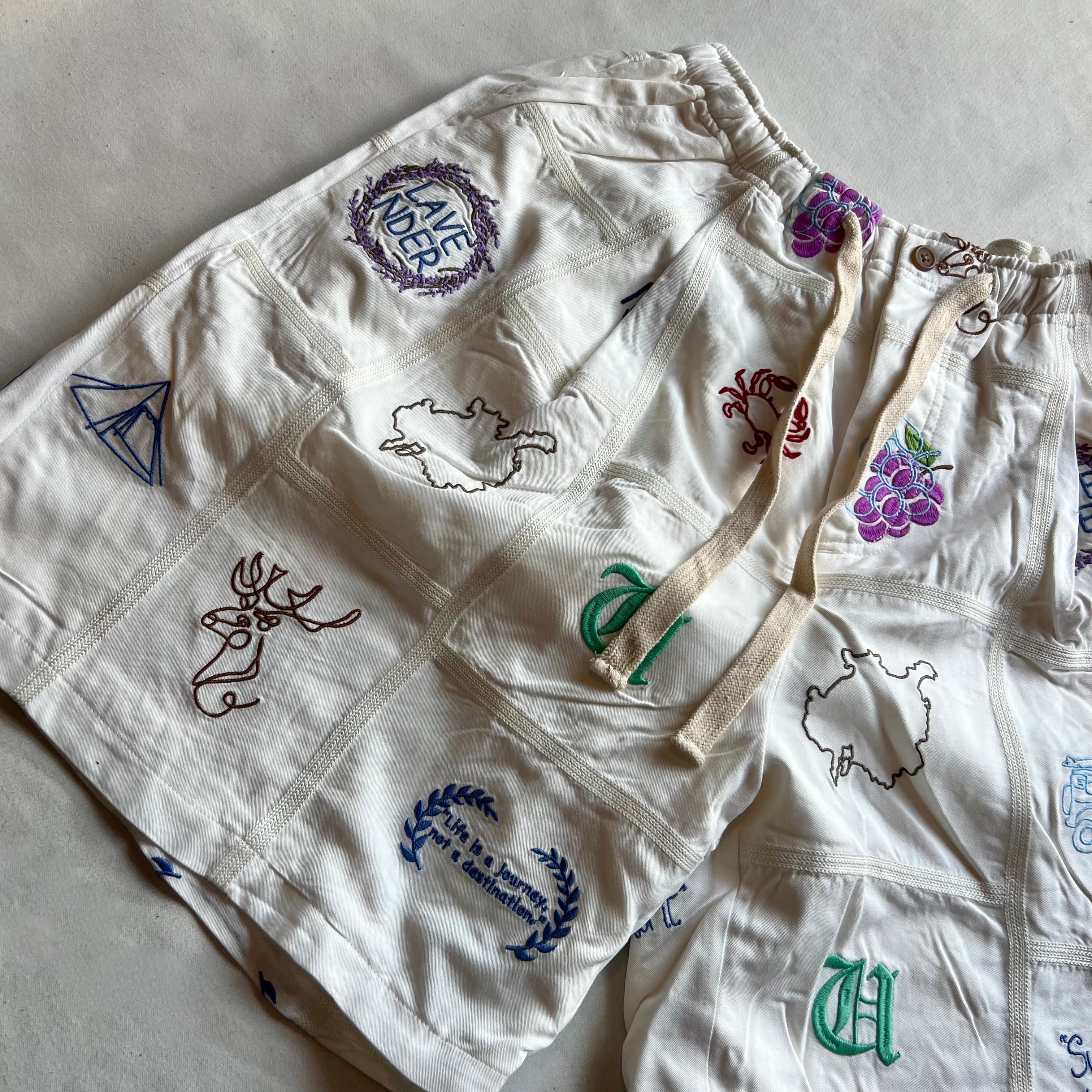 レーヨン100%のタックショーツにパッチワーク風に刺繍を施した総柄ショートパンツ。