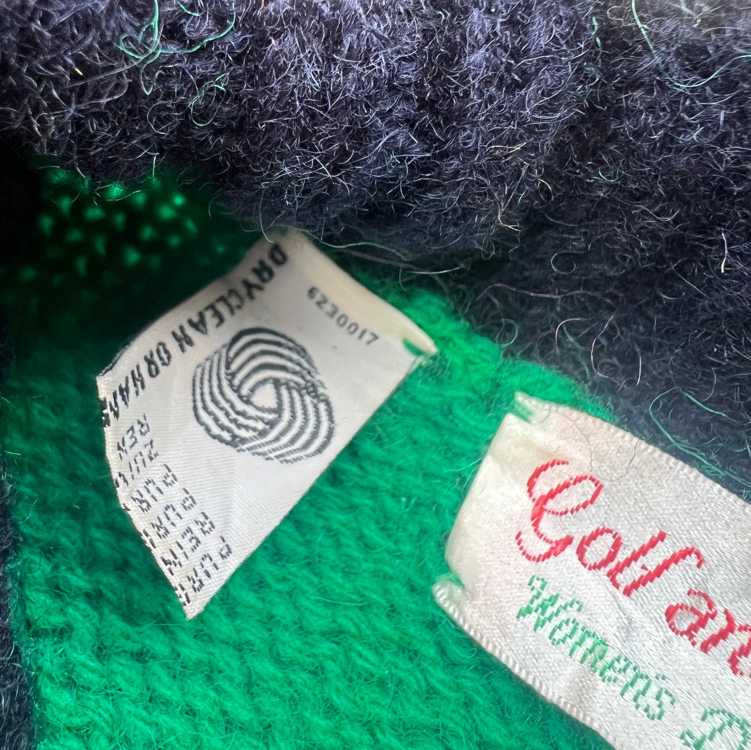 グリーンとネイビーの配色が目をひくタートルニットプルオーバー。