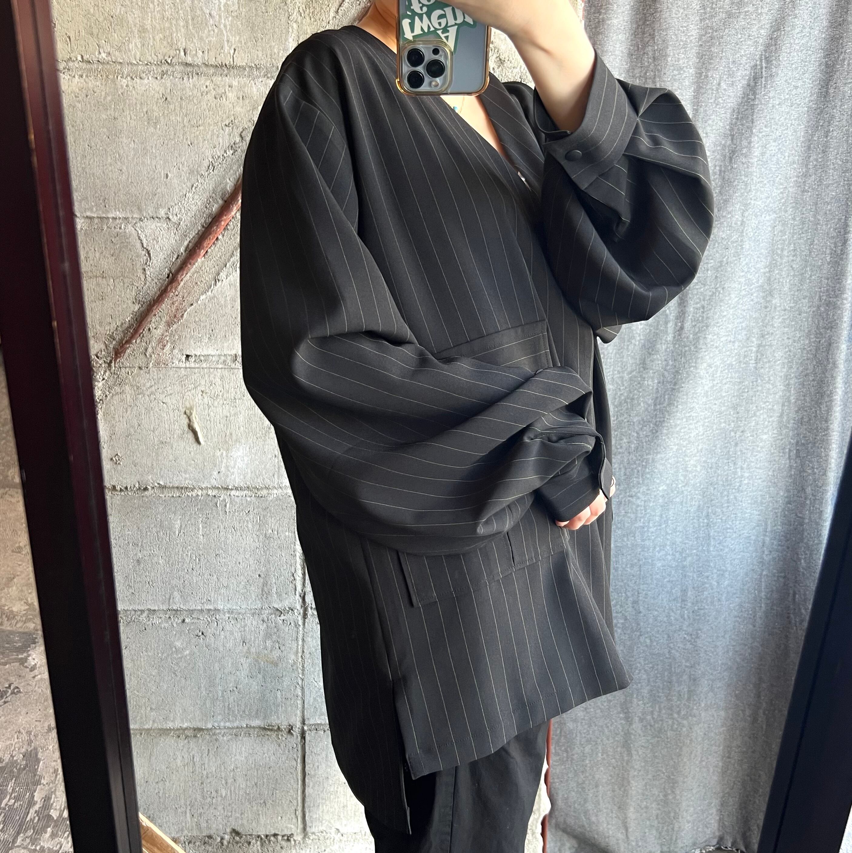 オチ感とトロミの有るピンストライプ生地で製作したカーディガン風シャツジャケット。