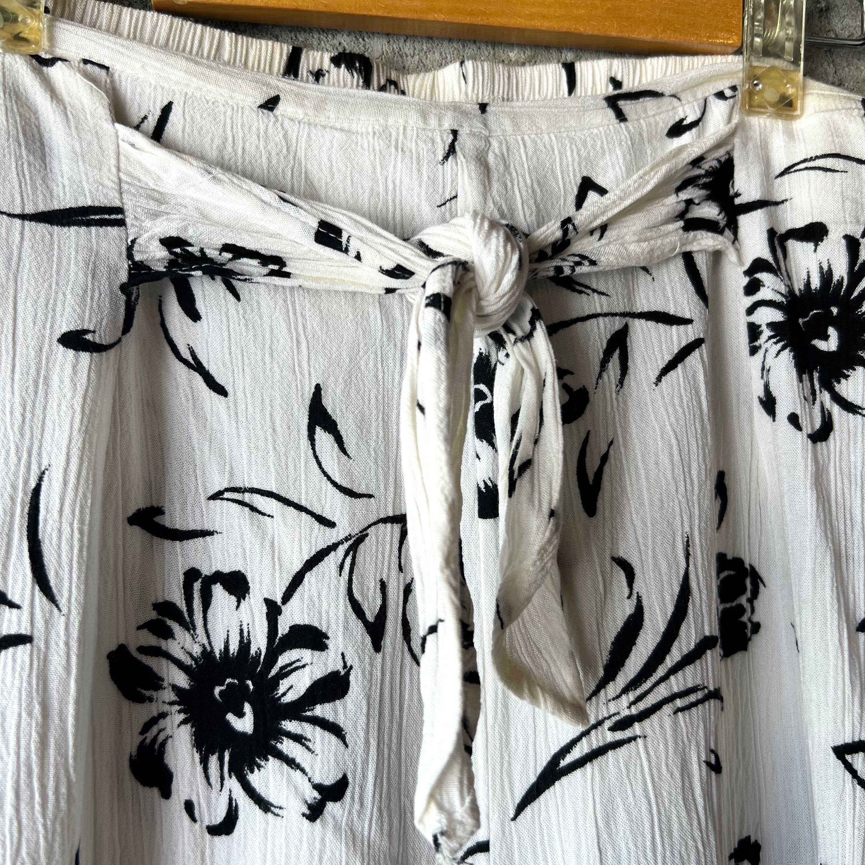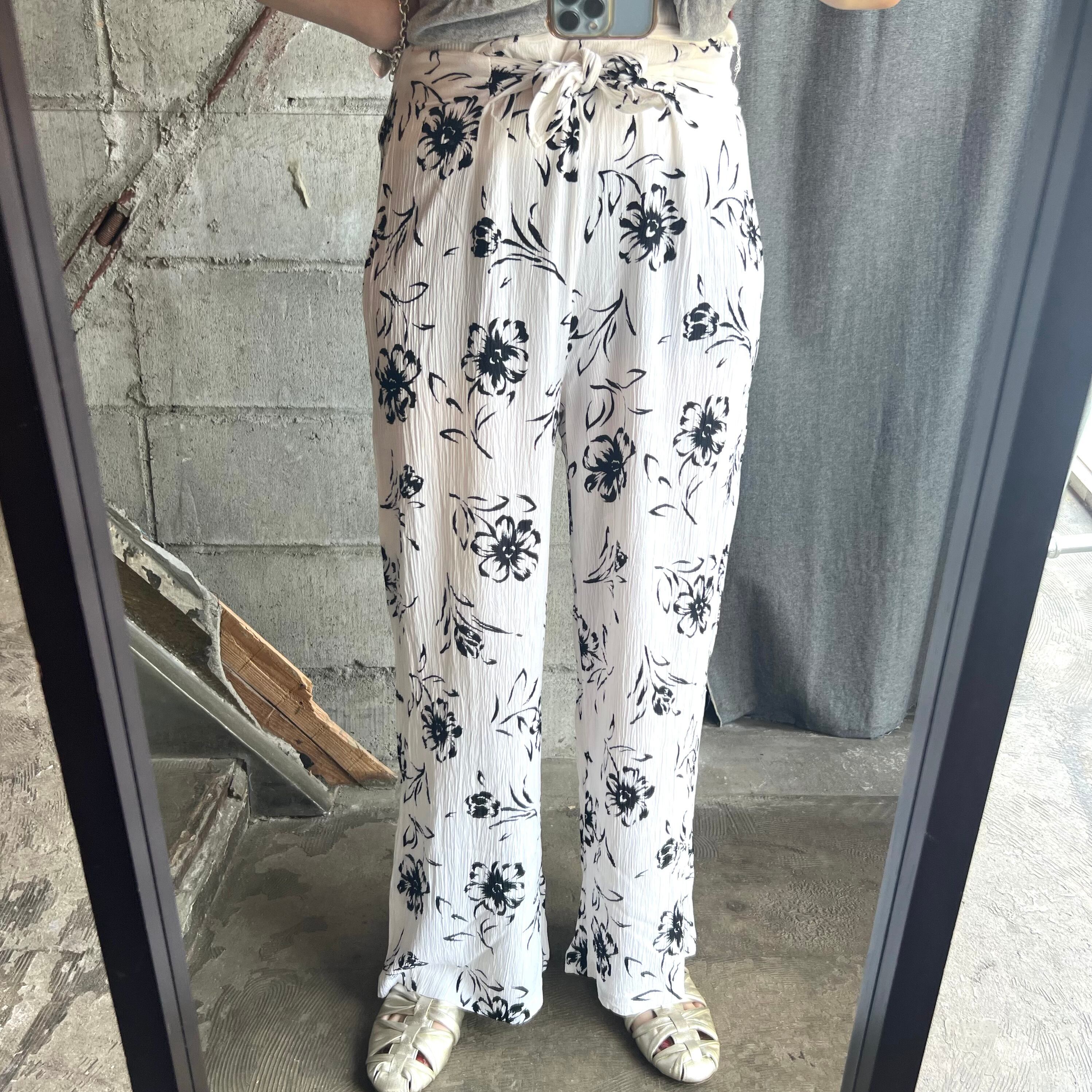 レーヨンの落ち感とモノトーンの花柄で大人っぽい印象の一枚。