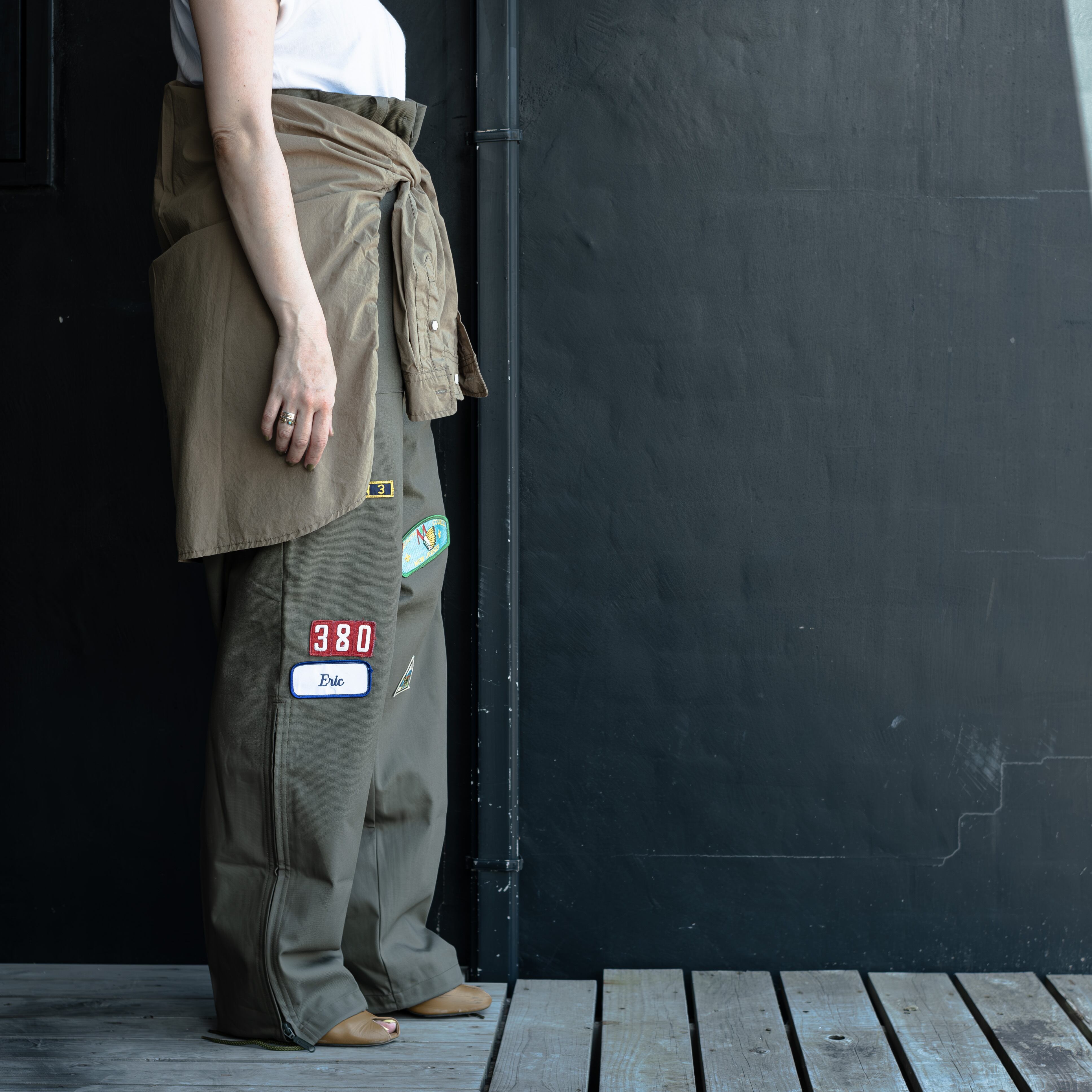 ワッペンを貼るだけでは面白くないのでオーバーパンツ特有のサイドの貫通ポケットはそのままに実用性も考え同パンツの生地を用いて別でフロントポケットを作成。