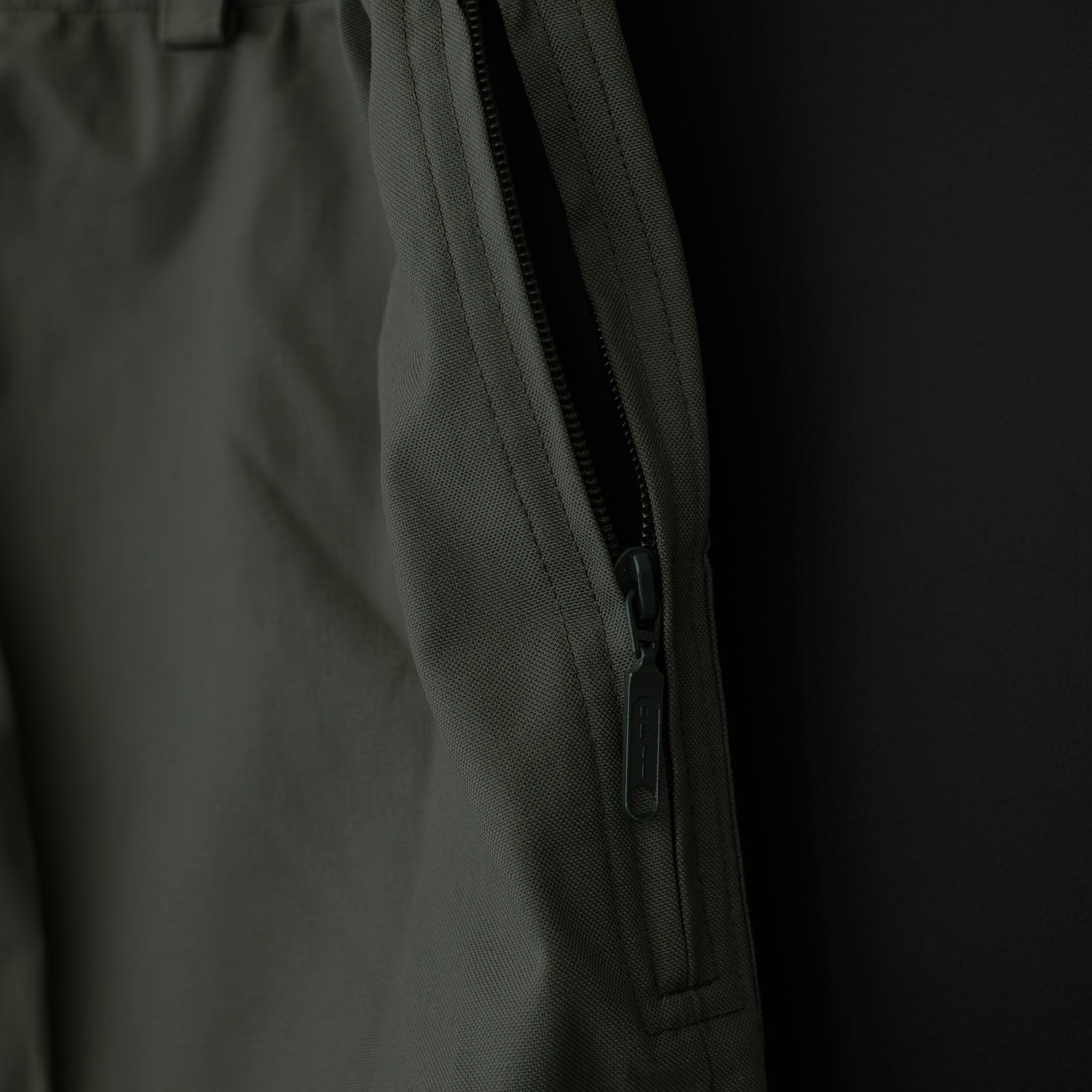 ベースはスイス軍山岳隊のパンツで、本来パンツの上から着用するオーバーパンツのため、両サイドのポケットは内側へのアクセスポケット仕様。