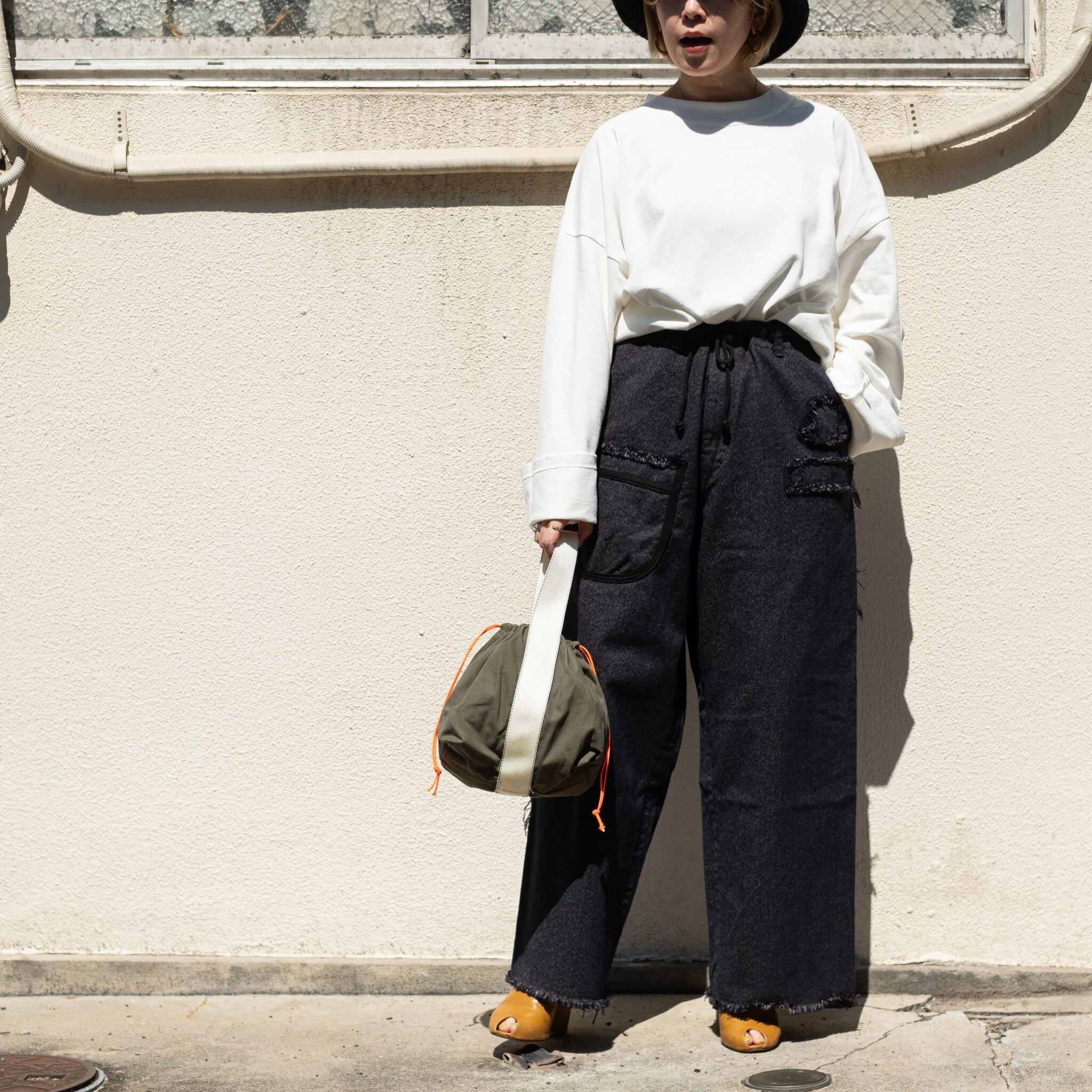太番手で白と黒の杢調のデニムを使用したワイドテーパードパンツ。(マスターキーが定番的に作り続けている人気の形です)