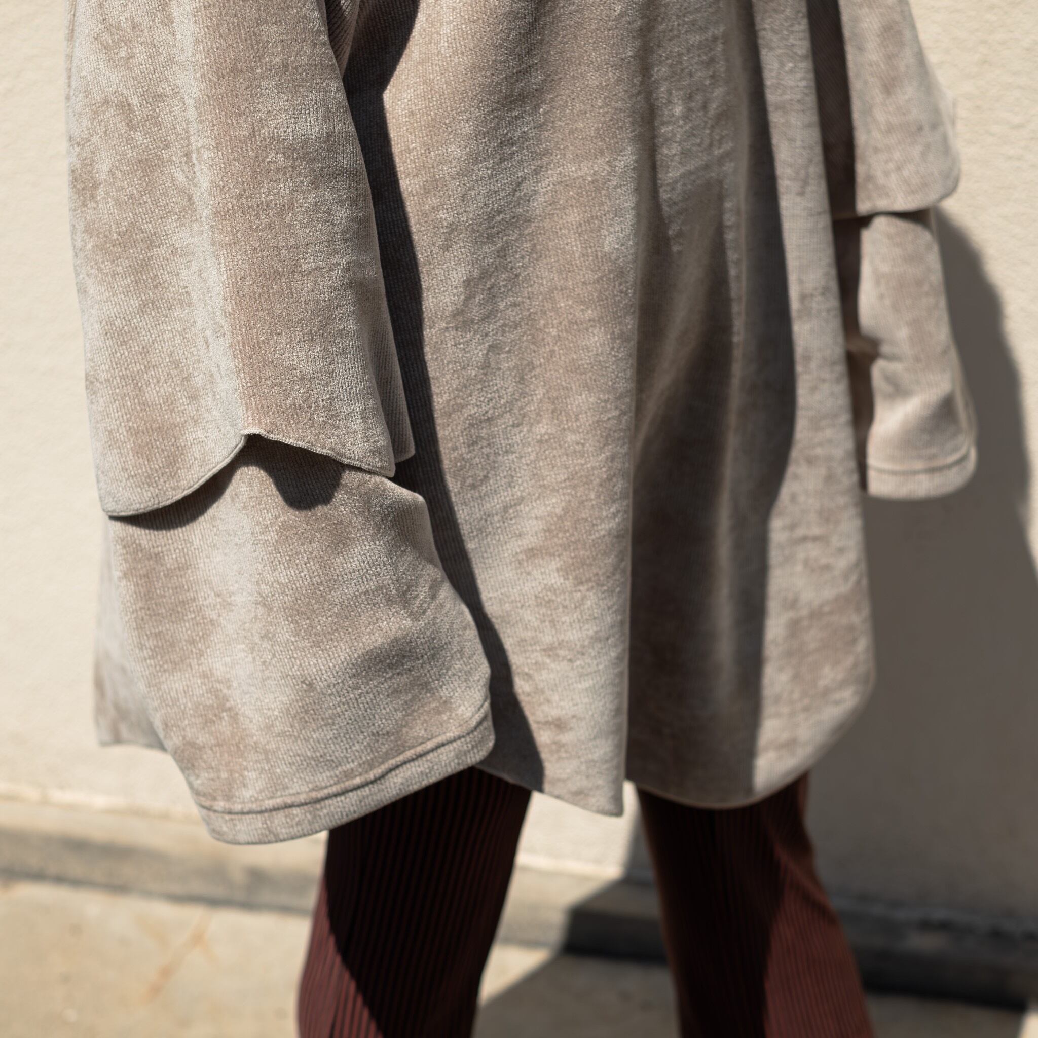 モール糸を使用しているので別珍に洗いをかけたような様なビンテージ感があり、角度によって表面の見え方が変わるのも特徴です。