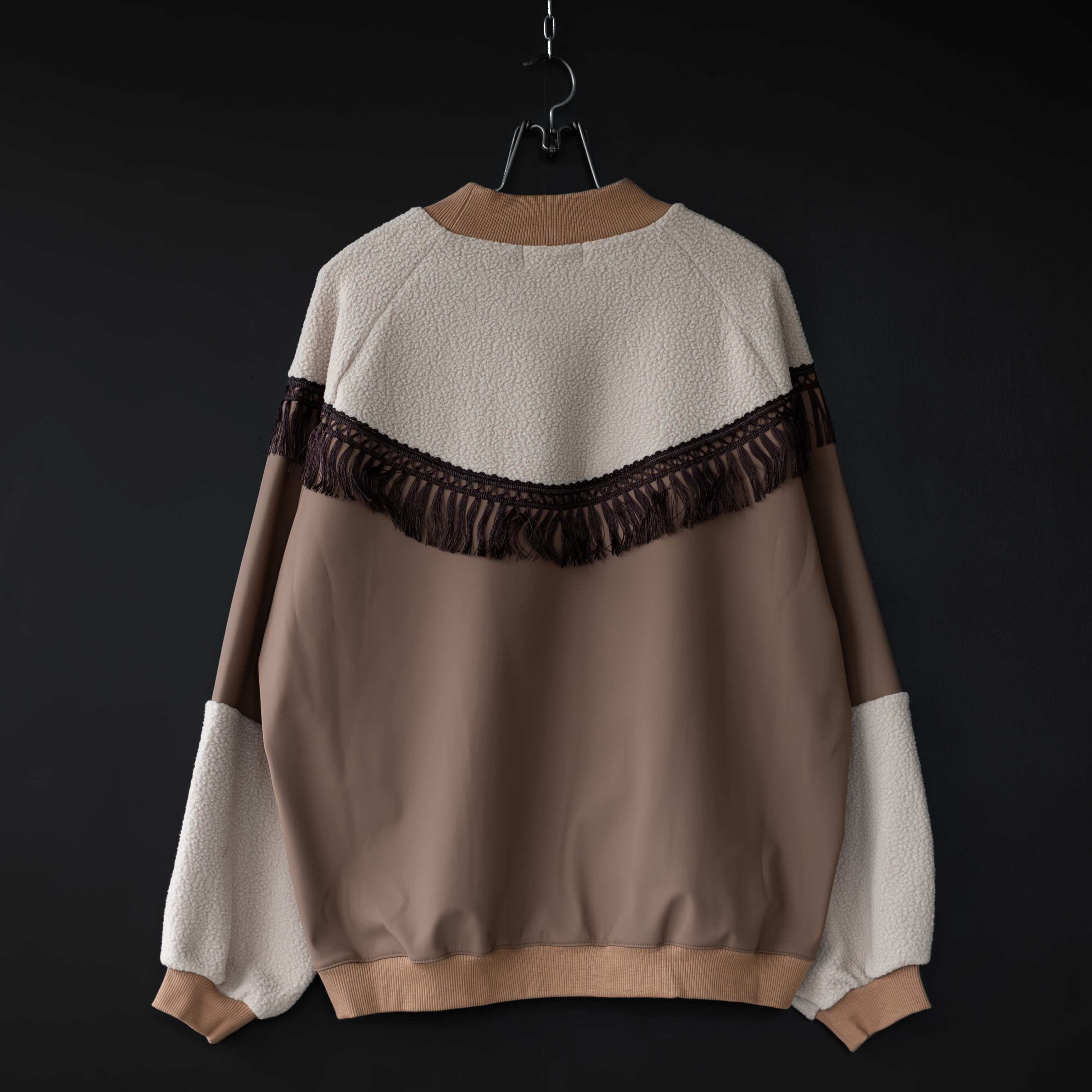 切り替え部分に毛足の長いフリンジテープを配置する事で機能的で有りながら民族的要素も併せ持ったハイブリッドカットソーに。