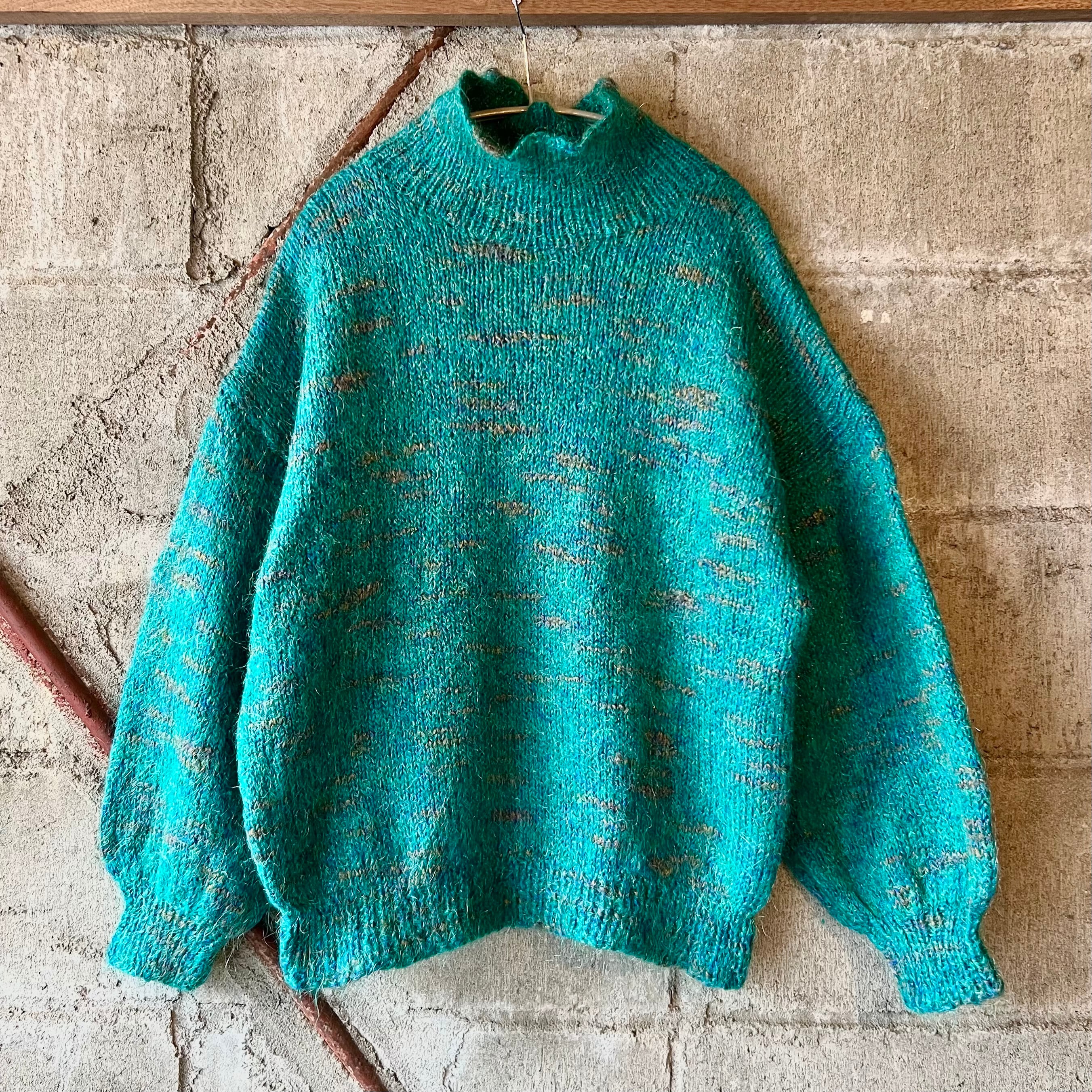 きらきら光るモヘア調のニットを使用したタートルネックのプルオーバーニット。