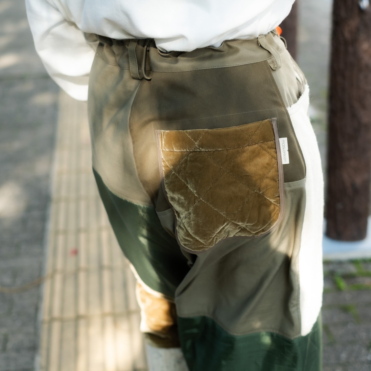 メインはデットストックのM51ライナーパンツを使用してフィッシャーマンセーター・ベルベットにキルト加工した生地・フランス軍のコンバットパンツ・新品のバックサテン素材を用いて