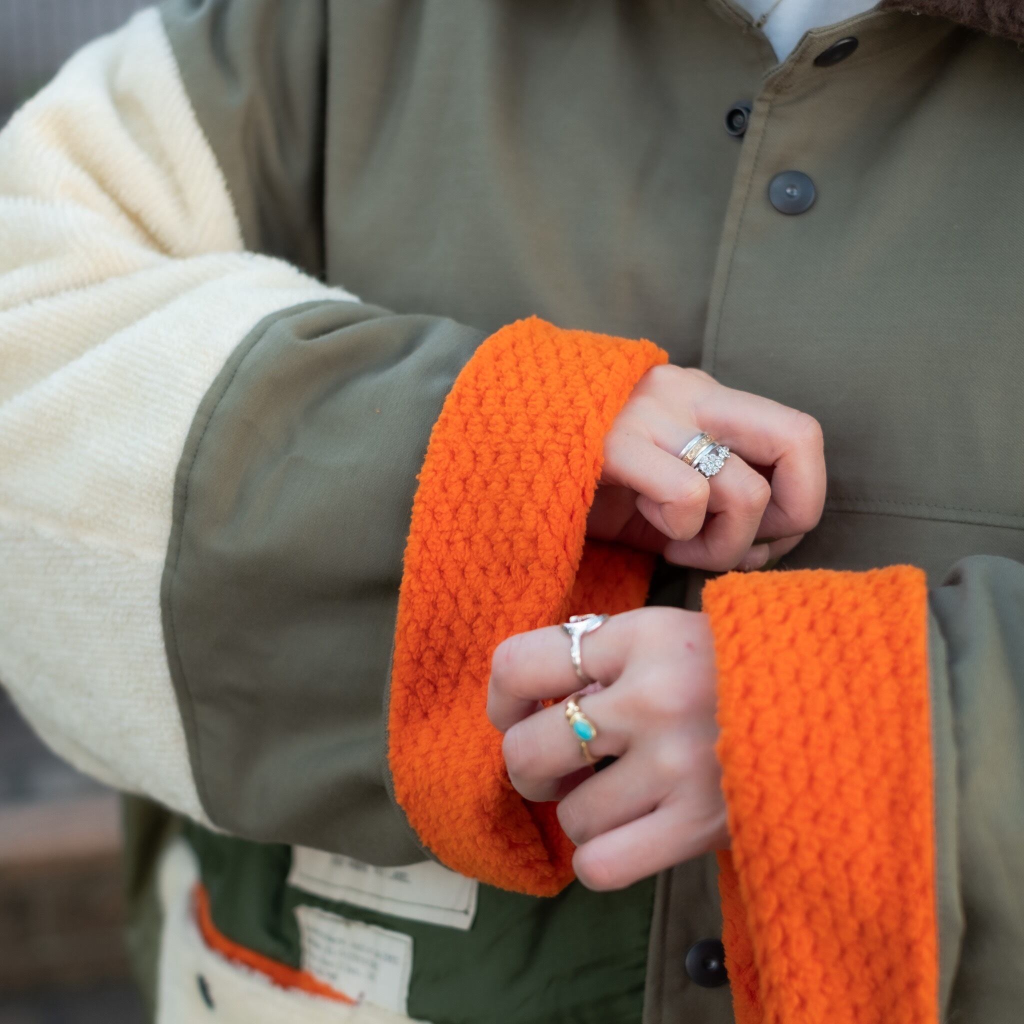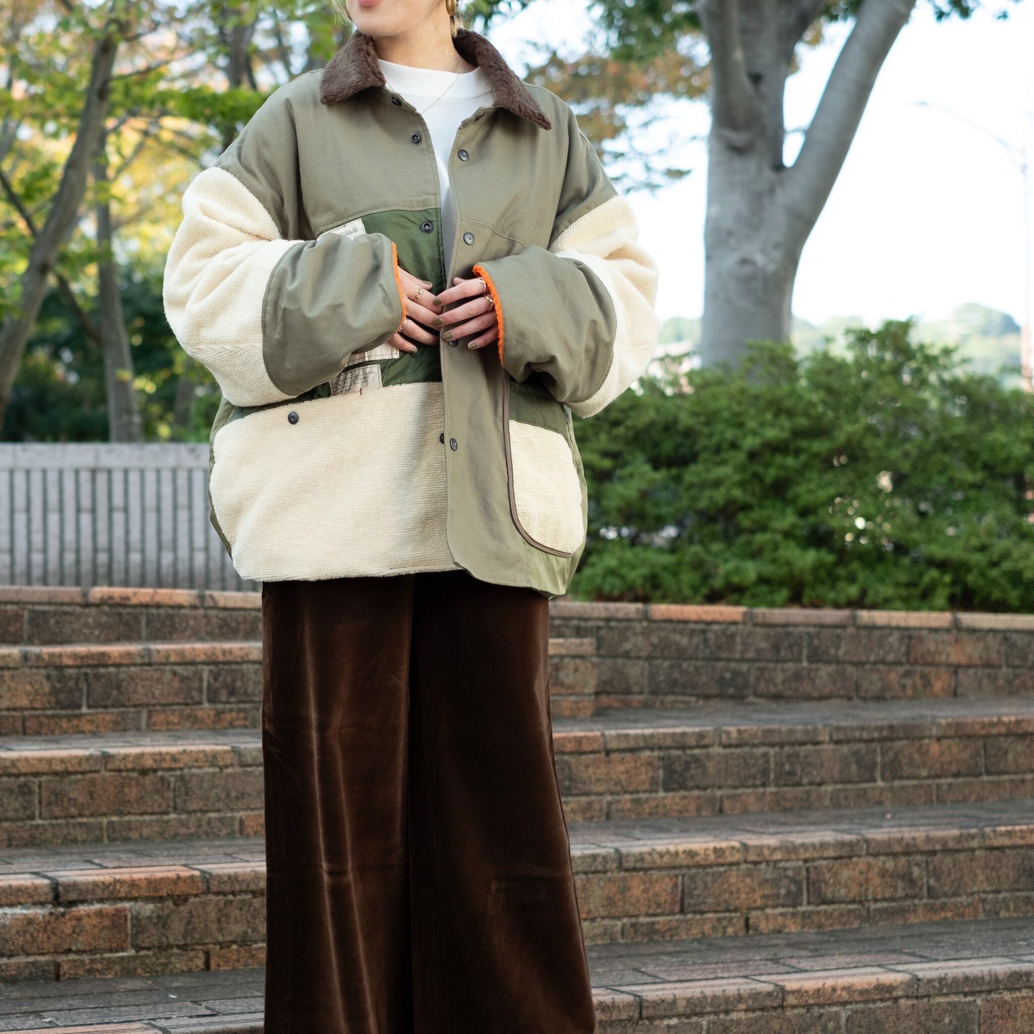 メインはデットストックのM51ライナーパンツを使用して襟部分はドイツ軍のUSEDボア、新品のバックサテン素材を用いてアップサイクルしたミリタリージャケットです。
