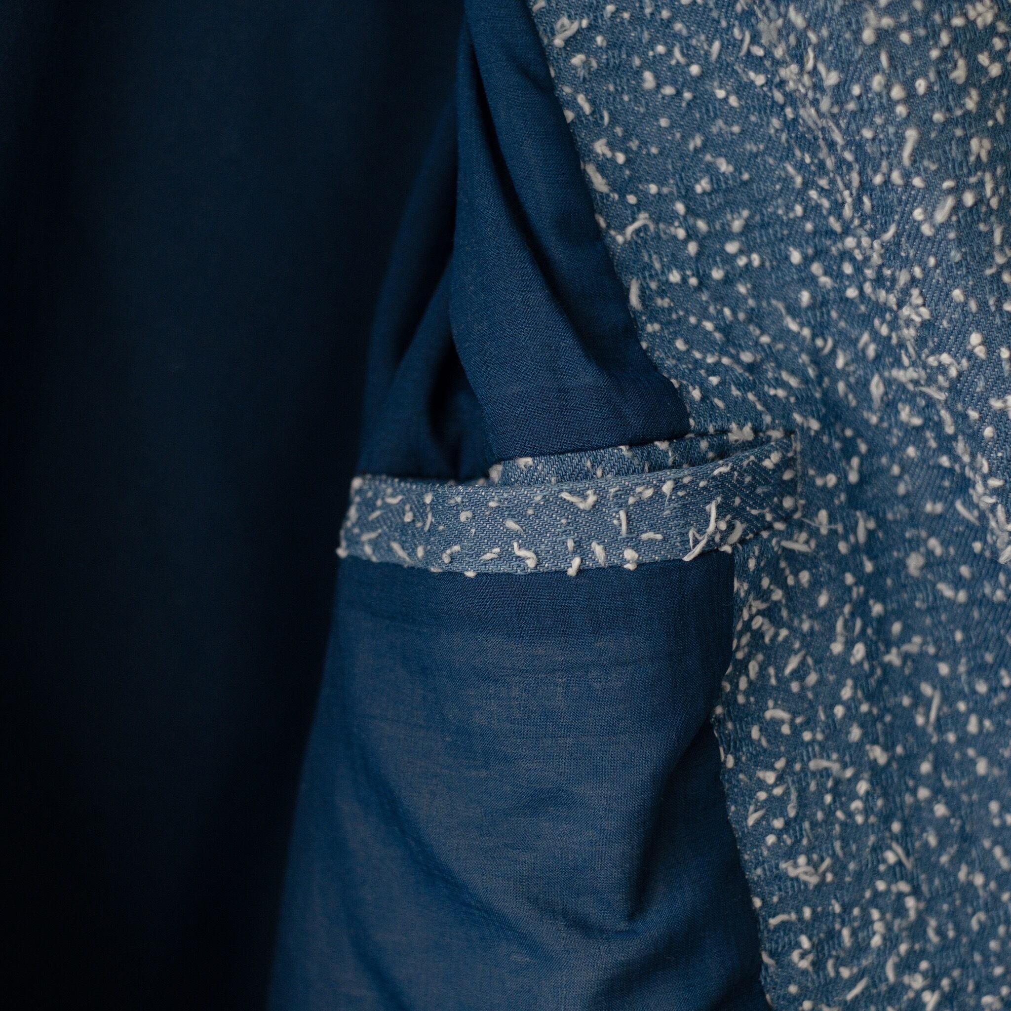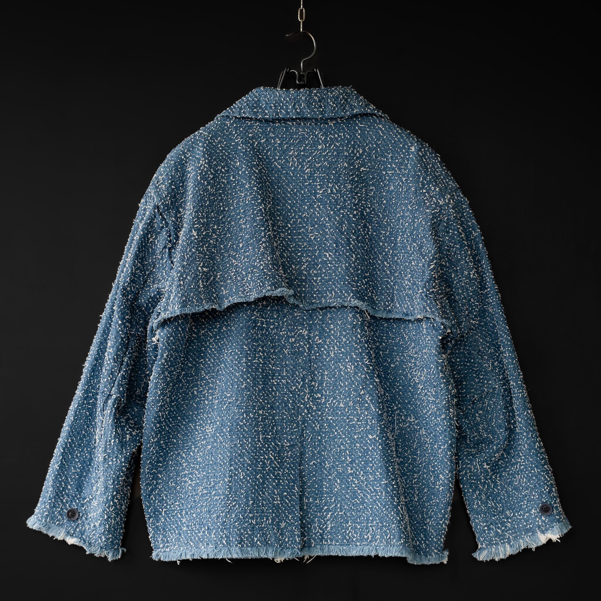 デニム素材にニードルパンチ加工(生地に針を差し込み、裏の糸を表に引き出す加工方法)をする事で生地の表面にネップの様な表情が生まれ、唯一無二なオリジナルデニムを制作。