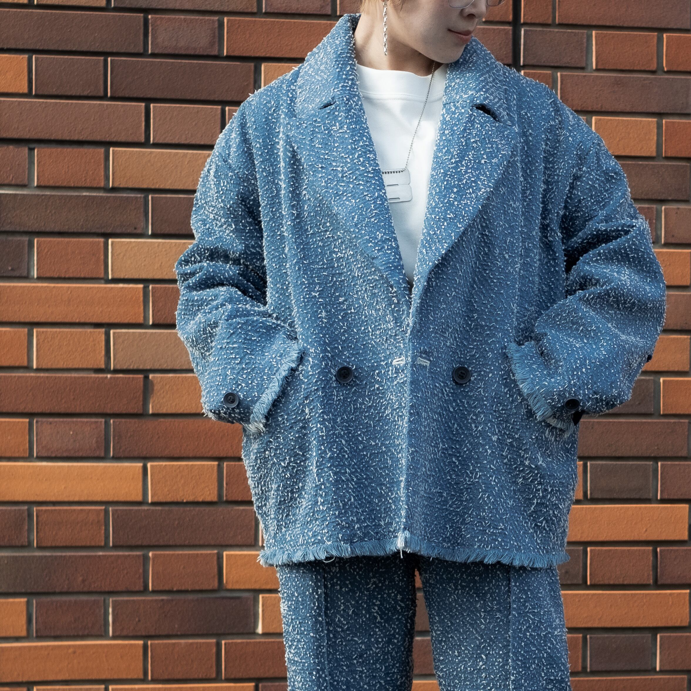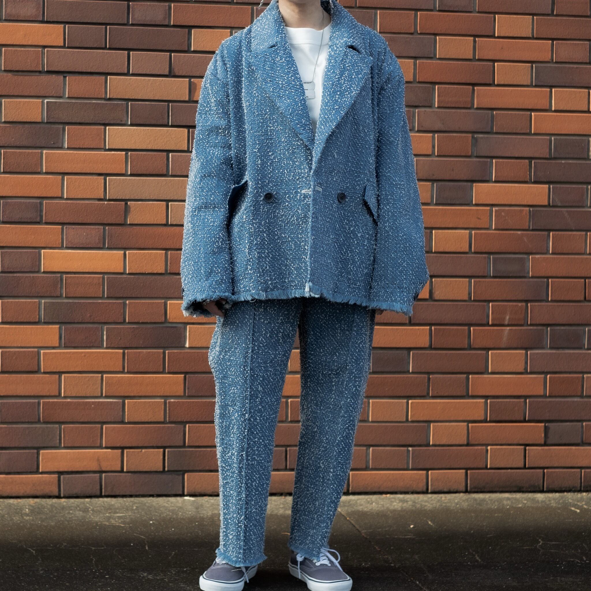 そのデニムを用いて襟・ラペル部分を広くしダブルブレストのドレッシーなテーラードタイプに仕立てました。